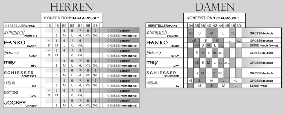 Aus der untenstehenden Liste können Sie Ihre Wäschegröße via Kleidungs-Konfektion ableiten: